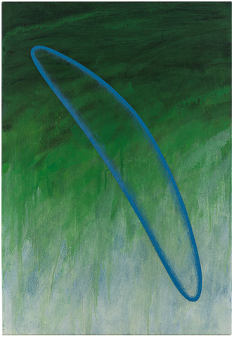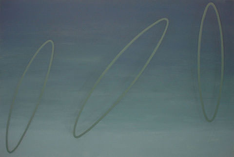 2001年に帰国した近藤は、前年の心友の死を悼み、1970年に制作したThree Diagonal Stripes: Green を正方形のカンバスに復活させた。「馬場彬へのオマージュ」である。2002年には練馬区立美術館が「近藤竜男ニューヨーク⇔東京1955~2001」を開催。1950年初頭から、渡米、帰国迄の作品を網羅、充実した回顧展であった。2010年1月、ギャルリー東京ユマニテは新作による近藤竜男展を開く。新作群は一見Ellipseシリーズと感じるが、しかし楕円のオブジェは輪郭線で表現され質量も持たず、Ellipseシリーズとは異なり空中を自由に浮遊し形を柔らかく変えてゆく。もし、このオブジェ達を楽器から出た音の形象と見るなら、描いていた近藤の耳には、1967年11月9日の小澤指揮による武満の、ノヴェンバーステップスがよみがえっていたのであろうか。「見る音楽」の新作、Blue Painting:J-09 と Gray Painting:J-09 は、近藤作品の至上の理解者であり、同世代であり、56歳で没したフライ氏への追億の絵であるようにも思われる。