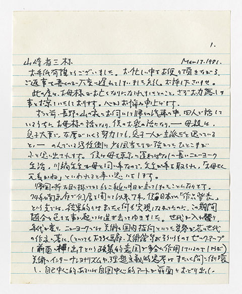 ニューヨークでの事を、一度 文にまとめて見ようということは、何時も考えながら、まるで具体的に動き始めることが出来ません。写眞のネガも厖大な量になってしまい、なんとかしなければと思っています。そう思いながらも、毎日毎日があまりにも早く過ぎてしまい、美術手帖の海外欄のように、どうしようもなく〆切に追われゝば、やっと、どうにか書くといったところです。作品も、文も、写眞も、まったくの未整理で、なんとか、根本から生活体系も変えなければ、何時までたっても同じことで、このまゝ、コロッと死んでしまえば、まったく、なにもかにも、ばらばらの未整理のまゝだと、この頃ふと、そんな不安も感じます。ニューヨークの事を文にして見るのは、今年、77年。少なくとも80年、あるいは、僕がニューヨークへ来たのが61年だから、81年まで、じっくり見て、ニューヨークの20年間をかえり見ても良いのではないかと思っています。もっとも 60年代と70年代は一緒には、出来ないでしょうが。
